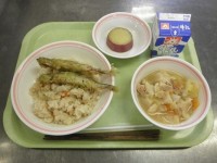 【献立】大根飯、牛乳、ししゃもの天ぷら、すいとん、ふかし芋【きゅうしょくつうしん...