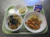 【献立】ミルクパン、牛乳、鯨の竜田揚げ、はるさめサラダ、中華風コーンスープ、いち...