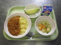 【献立】鉄骨ドライカレーライス、牛乳、じゃが芋入りサラダ、メロン【きゅうしょくつ...