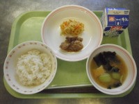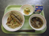 【献立】山菜ご飯、牛乳、ししゃもの石垣揚げ、沢煮椀、浅漬け【きゅうしょくつうしん...