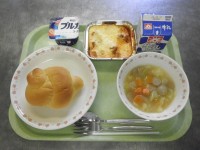 【献立】パンプキンパン、牛乳、ブルガリアのムサカ、ボブチョルバ【きゅうしょくつう...