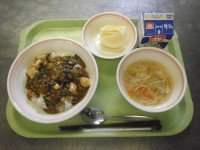 【献立】ご飯、牛乳、いかのチリソース、もやしとわかめのごま醬油、卵スープ【きゅう...