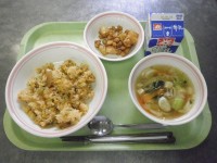 【献立】キムチ炒飯、牛乳、春雨スープ、じゃが芋のあめがらめ【きゅうしょくつうしん...