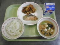 【献立】ご飯、牛乳、鮭の香味焼き、じゃが芋のきんぴら、みそ汁【きゅうしょくつうし...