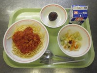 【献立】スパゲティ・ペスカトーレ、牛乳、さつま芋入りサラダ、プルーン【きゅうしょ...
