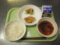【献立】ご飯、牛乳、鶏のピリ辛焼き、ごまあえ、田舎汁【きゅうしょくつうしん】みな...