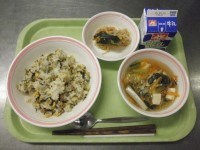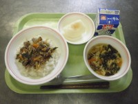 【献立】高菜とひき肉の炒飯、牛乳、春雨スープ、もやしのナムル【きゅうしょくつうし...