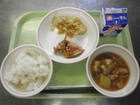 【献立】ご飯、牛乳、凍り豆腐のチリソース、野沢菜和え、いちごミルク寒天【きゅうし...