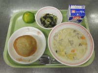 【献立】ごまのビスキュイパン、牛乳、秋のシチュー、海藻サラダ、みかん【きゅうしょ...