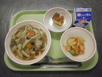 【献立】お彼岸うどん、牛乳、ごまドレサラダ、さつま芋のケーキ【きゅうしょくつうし...