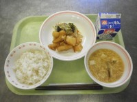 【献立】ご飯、牛乳、魚のあずま煮、小松菜のあえもの、みそ汁【きゅうしょくつうしん...