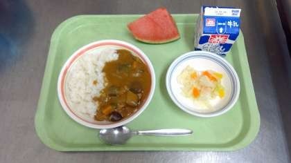 夏野菜ポークカレーライス あらびき大豆のサラダ 果物 牛乳