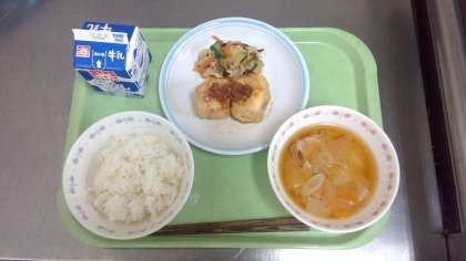 ごはん 揚げ出し豆腐の薬味だれ 豚汁 ささみ入り塩昆布キャベツ 牛乳