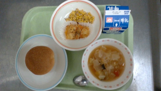 パン ポテトのチーズ焼き 夏野菜スープ とうもろこし(ソテー) 牛乳