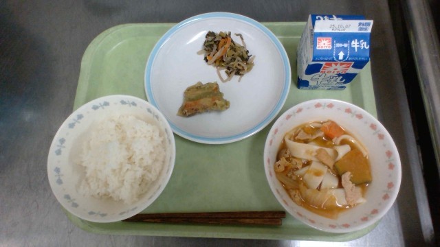 コラボ給食~with甲府市 ごはん ほうとう ちくわのお茶揚げ 野沢菜炒め 牛乳
