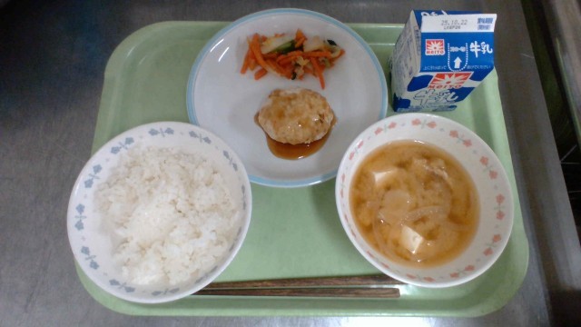 ごはん 鶏肉のつくね キャベツのみそしる 白菜のからし和え 牛乳