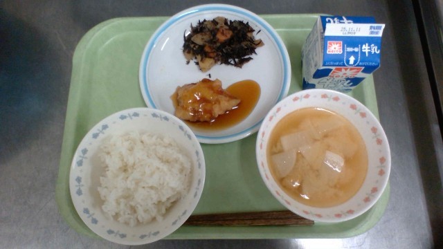 ごはん 鶏天 ひじきと根菜の土佐煮 かぶと油揚げのみそしる 牛乳