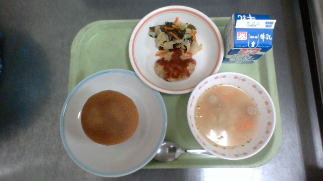 パン 洋風豆腐ハンバーグ わかめサラダ ABCスープ 牛乳
