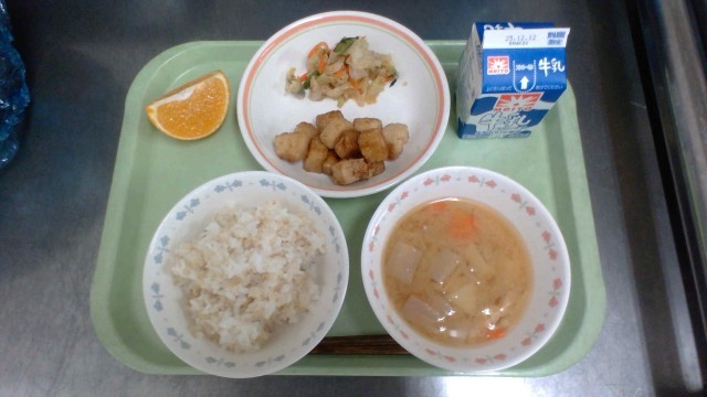 玄米ごはん 高野豆腐のオランダ煮 いなかじる 土佐和え 果物 牛乳