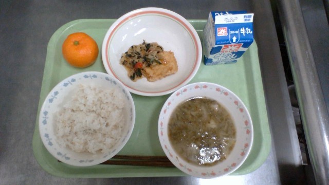 コラボ給食~with服部学園(和食) 麦ごはん カジキのから揚げ生姜ソース あおさと根菜のみそしる 果物 牛乳