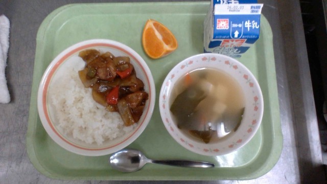 ごはん 酢豚 わかめスープ 果物 牛乳