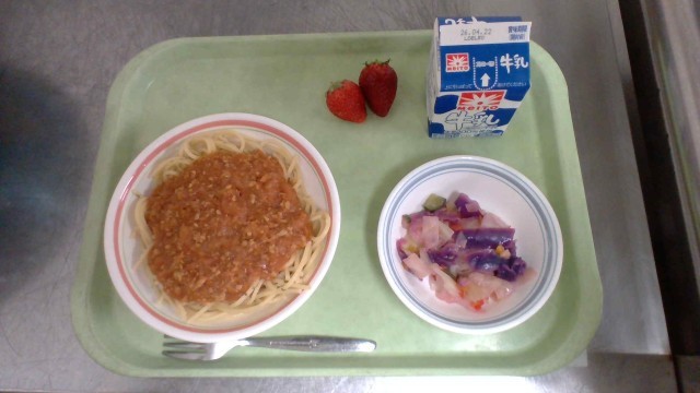 スパゲッティミートビーンズ 春色サラダ 果物 牛乳
