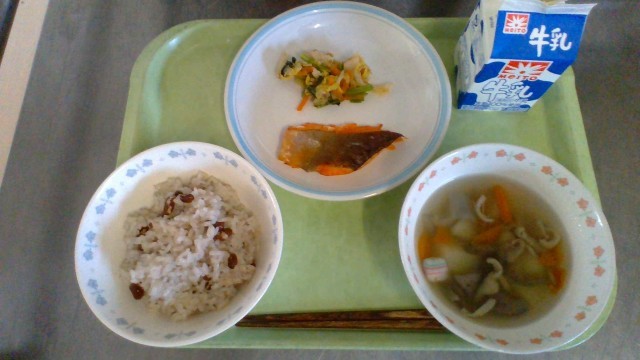 開校記念こんだて  開校祝い赤飯 焼き魚 土佐和え お祝い根菜汁 牛乳
