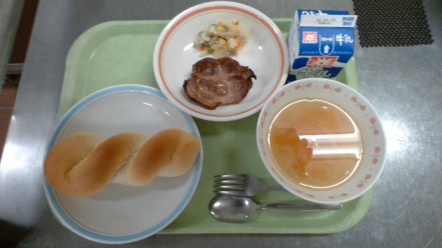 4月22日の給食 パン 照り焼きポーク ジュリエンヌスープ 春色マッシュポテト 牛乳