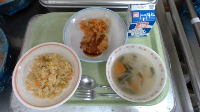 カレーピラフ コロッケ 白菜のスープ ツナサラダ 牛乳