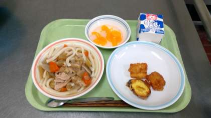 10月15日の給食は、いなかうどん 天ぷら 果物缶 牛乳 です。