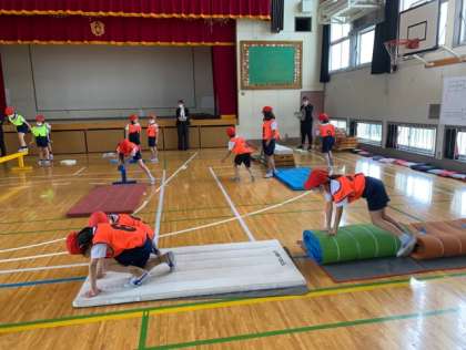 本校は今年から体育科の研究をしています。今日は2年2組が跳び箱を使った運動遊びの研究授業をしました。トリオグループで3つの場を順番に回り、跳んだり、手をついたり、跳び箱にまたぎ乗ったりしながら楽しく取り組みました。めあてをもってしっかりと運動できました。