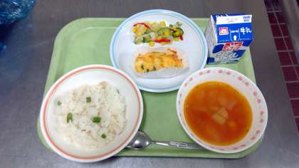 アフリカ・タンザニア料理 ピラウ(ピラフ) タジン(オムレツ) スープ・ヤ・フェザ コーンサラダ 牛乳