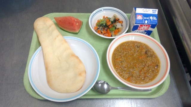 ナン ドライカレー 鉄骨サラダ 果物 牛乳