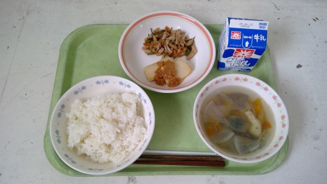 かみかみ献立  ごはん 焼きいかのねぎだれ すきこんぶのにつけ 根菜のすましじる 牛乳