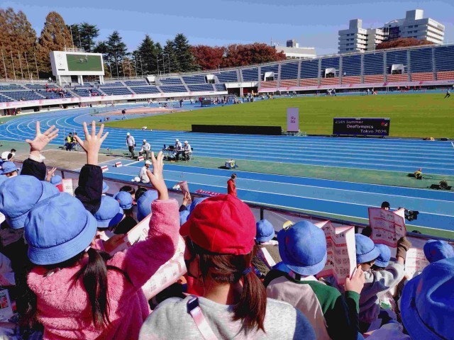さて、先週の金曜日に、3年生がデフリンピック観戦に行ってきました。駒沢競技場で陸上の試合を応援してきたそうです。デフリンピックは、皆さんも知っている通り、「耳がきこえない」または「きこえにくい」人のためのオリンピックです。1924年にフランスのパリで始まり、なんとパラリンピックよりも歴史が長いそうです。日本で開催されるのは、今回の東京大会が初めて。70を超える国と地域から、約3000人の選手が参加しています。