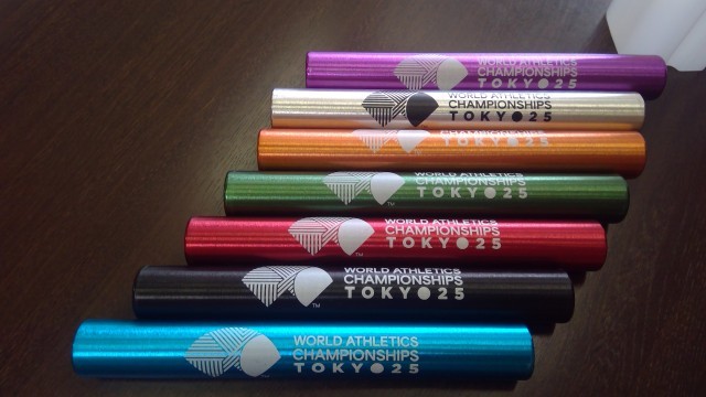 このバトンは、選手も使う本格的なバトンだそうです。ぜひ体育の授業で、皆さんも使ってみてください。そして、9月の世界陸上をみんなで応援しましょう。校長先生は、北口選手のやり投げや、400mリレーなどが楽しみです。