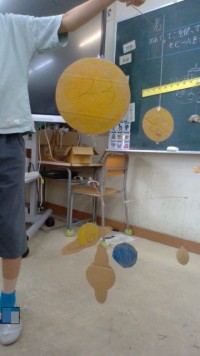 6年生は「てこのはたらき」の学習でモビールを作りました。てこを傾ける力の大きさは、支点からの距離とおもりの重さの掛け算で求められることを活かし、飾りが水平になるように工夫していました。