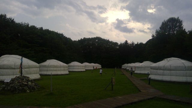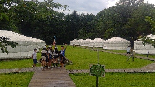 今日から那須自然体験教室が始まりました。5年生と一緒に那須のモンゴリアンビレッジに来ています。広い敷地にたくさんのゲルがあり、モンゴルに来たような気分になります。ビレッジでお昼ご飯を食べた後、牧場見学を行いました。チーズの試食をいただい後、ビレッジに戻り、開園式です。あいにく雨が降り出しましたが、その雨のおかげで気温が下がり、夕方はとても涼しいです。ヒグラシが鳴いていて、子供たちは雨上がりのビレッジで虫やカエル探しに夢中になる等、自然を満喫しています。先ほどお風呂に入り、冷たいジュースを飲みました。これから夕食を取り、キャンプファイヤーの予定です。
