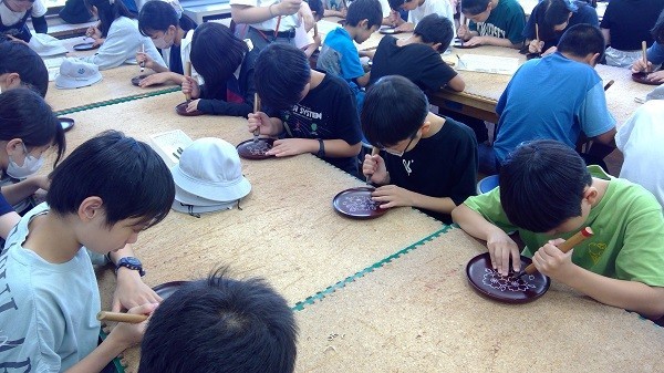 「日光木彫りの里」で日光彫の体験をしています。図工で使う彫刻刀とは異なるのではじめは苦戦していましたが、コツをつかむとどんどん掘り進める様子が見られます。この後、お昼になります。
