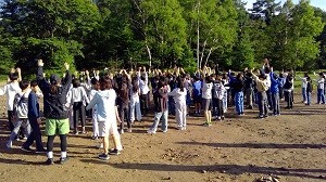おはようございます。日光は涼しい朝です。興奮して早く起きてしまった子供もいたようですが、全員元気に2日目の活動をスタートしました。湯の湖の湖畔で朝会を行い、保健・入浴係が中心になって朝の体操も行いました。