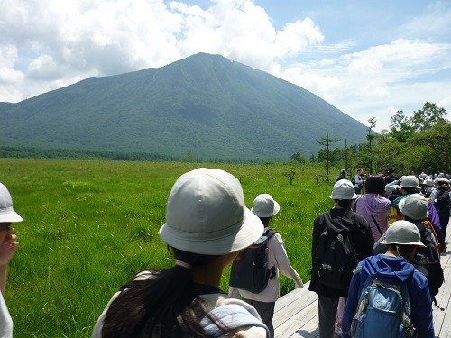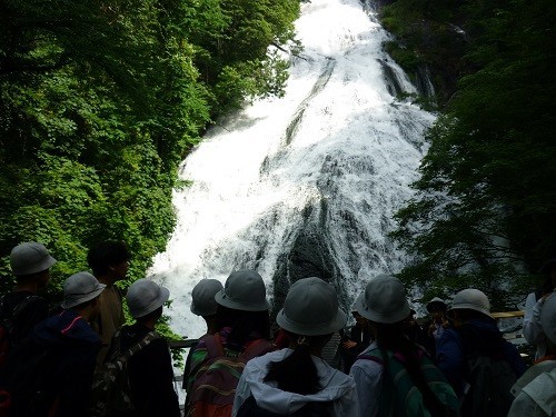 日光高原学園2日目は朝から晴れて、ハイキング日和でした。朝8時過ぎには宿を出発し、湯ノ湖で記念撮影をしてハイキング開始。湯の湖の湖畔を歩いてまずは湯滝へ。1枚目の写真ですが、今年は水量が多く、とても力強い滝を見ることができました。その後は湯滝から赤沼までのハイキングです。約4㎞あり、なかなかの距離です。林道を抜けると戦場ヶ原が広がり、2枚目の写真のように男体山が見えます。子供たちは水分を取りながら頑張って歩きました。ホテルに到着後、湯の湖の源泉と足湯へ。疲れた足へのご褒美です。