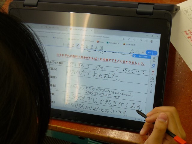 また、教室では、前期の頑張りや後期で頑張りたいこと等の自己評価を行っていました。紙に記入する子もいましたが、タブレットで行う子も多くいました。2枚目の写真は、メタモジのソフトを使って、タッチペンを使って書いている様子です。タブレットが新しくなって、ペンが付いたことで、画面上でも文字がとても書きやすくなりました。文字で書く大切さも指導していきます。