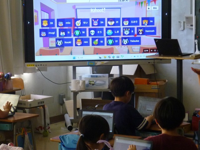 教室を回っていると、最後の日ですので、お楽しみの企画を行っているクラスが多くありました。最近の傾向として、ICT機器を使う場面が多いです。3枚目の写真は、「カフート」という無料のソフトを使って、学習のまとめゲームの準備を行っている様子です。個人の登録が終わるとゲーム開始。問題の早押しゲームですが、とてもよく盛り上がります。1年生から6年生まで、学習のまとめの時間や隙間時間に多くのクラスでよくやっています。