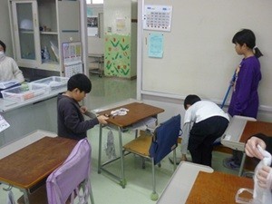式の終了後は、各クラスで通知表の授与やお楽しみ会等、思い思いの時間を子供たちは過ごしていました。3枚目の写真は大掃除の様子です。修了式で私からは「立つ鳥、跡を濁さずということわざがあります。自分のクラスをきれいにして次の学年に引き継ぎましょう。」と話をしました。どのクラスも掃除や後片付けを一生懸命にしていてうれしく思いました。