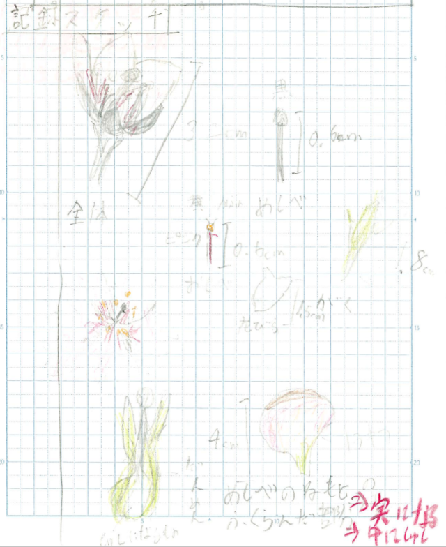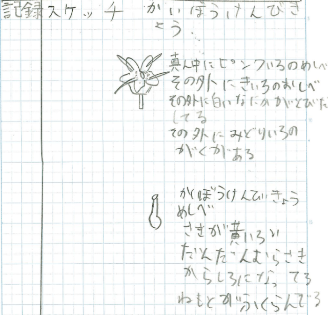 「単元でできるようになったことは、スケッチに花の様子を書くことです。大きさや、色などを細かく書くといいこともわかりました。他の単元のときでも、スケッチをかくことがあったらわかりやすくかきたいです。」