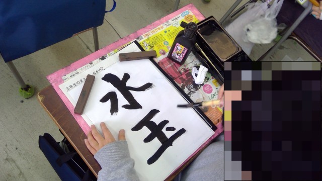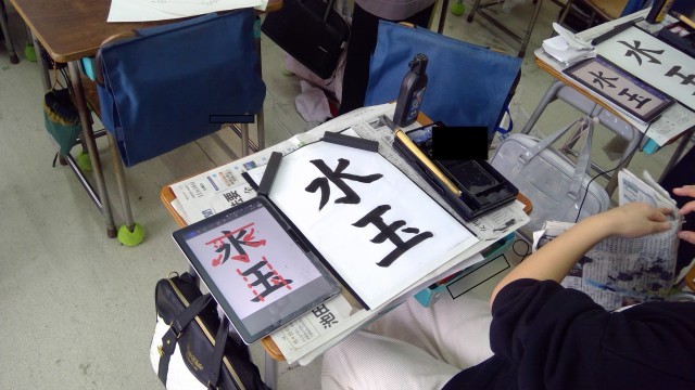 これまで学習してきた「はね」や「はらい」、「点」を生かし、『水玉』を書きあげました。