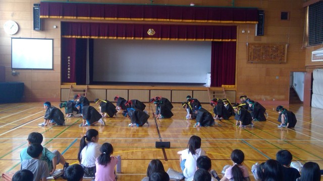 7月5日(土)の国際交流会に向けての「よっちょれソーラン」の練習の様子です。スペースの制約から、全員で踊ることができません。各クラスの先鋭合わせて28人が国際交流会に向けてがんばっています。当日をお楽しみください。