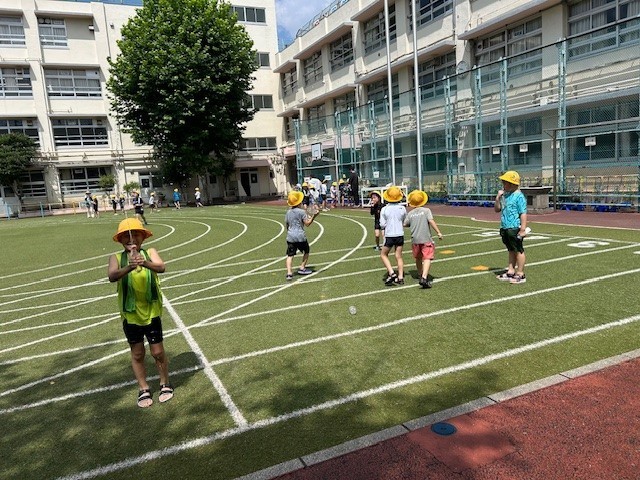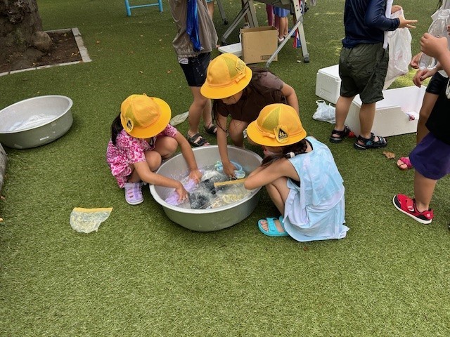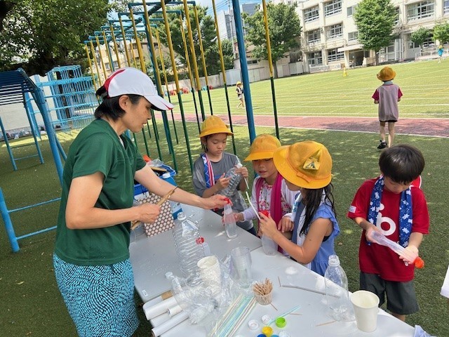 まずは、自分がイメージした遊びをとことん楽しむ姿がありました。容器に水をたっぷり入れて、広い校庭で友達と水鉄砲遊びをしたり、シャボン玉遊びをする子が多かった印象です。