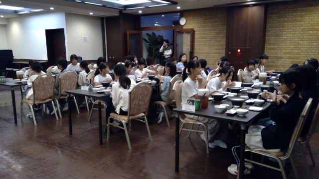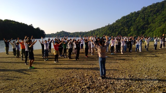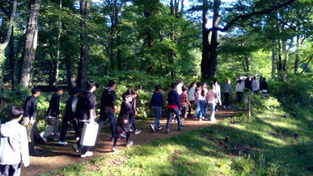 湯ノ湖畔に行き、朝会をしました。朝の挨拶のときには眠そうでしたが、ラジオ体操をして目覚めてきたようです。