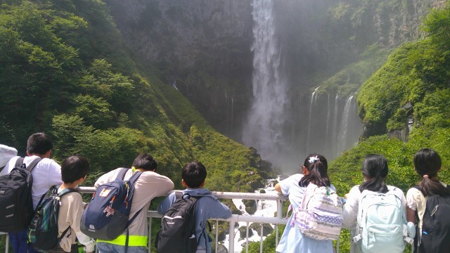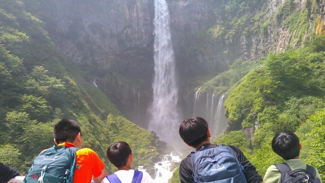そして、華厳の滝を観に行きました。水量が多く、迫力がありました。子供たちも、しばらく見入っていました。霧状の水が流れてきて、とても涼しかったです。